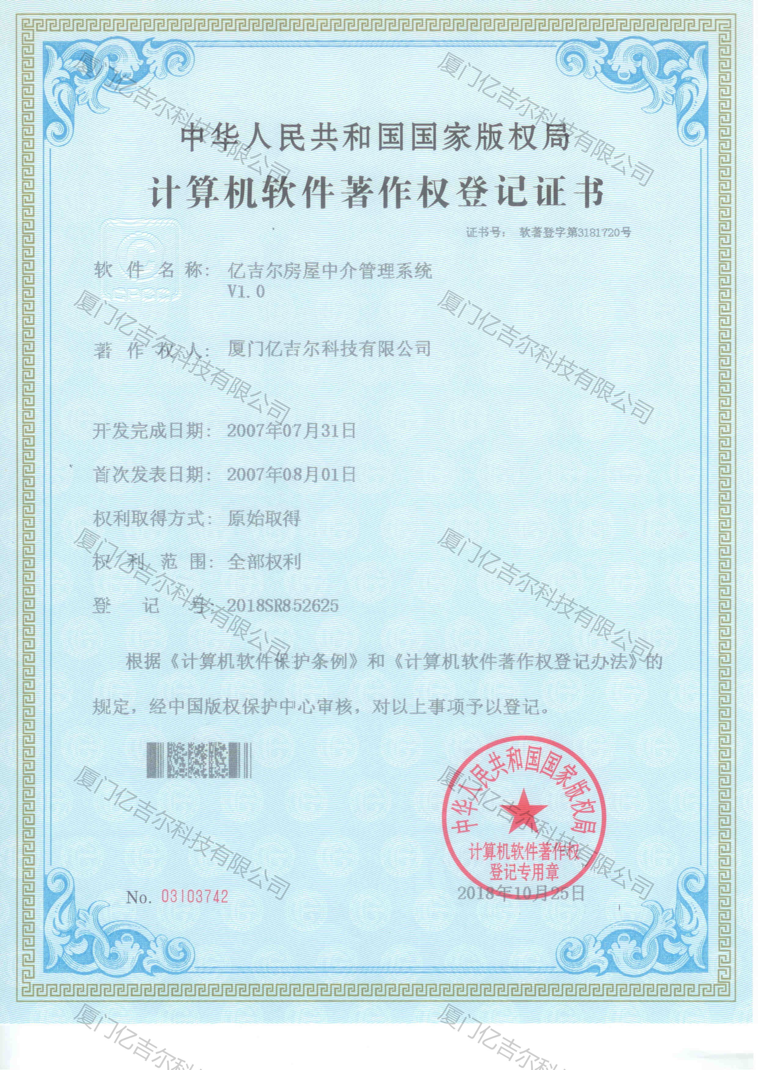 億吉爾房屋中介管理系統(tǒng)軟件著作權(quán)登記證書 發(fā)布日期:2018年10月25日 瀏覽次數(shù):3862 關(guān)鍵字: 公司 1/1億吉爾房屋中介管理系統(tǒng)軟件著作權(quán)登記證書